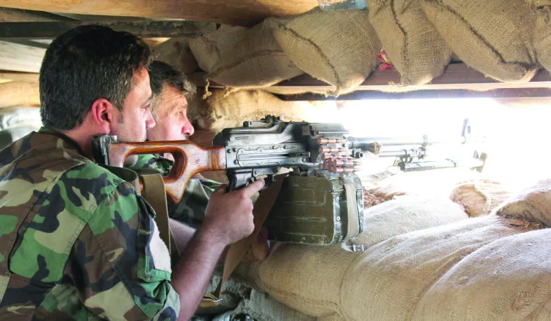 مقاتلان من قوات البيشمركة في الخطوط الأمامية بمحور الخازر القريب من الموصل («الشرق الأوسط»)