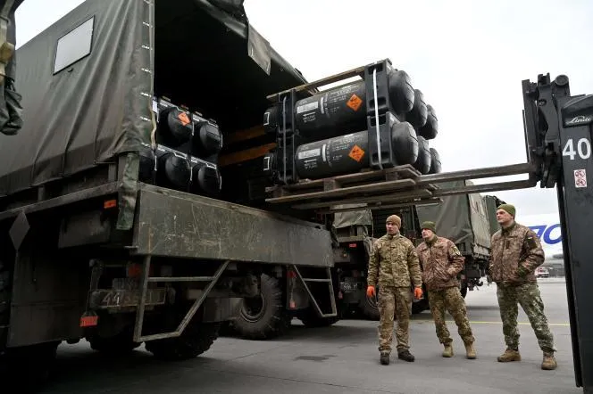 جنود أوكرانيون يضعون قاذفات صواريخ «جافلين» أميركية في شاحنة على مدرج مطار بوريسبيل الدولي قرب كييف في 11 فبراير 2022 (أ.ف.ب)