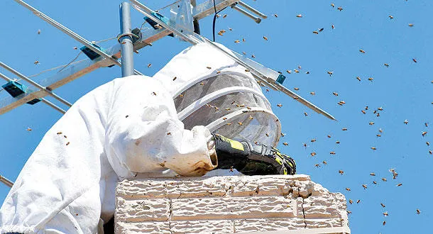 خبير نحل يزيل خلية من مدخنة أحد المنازل في مدينة فينيكس الأميركية (أ.ب)