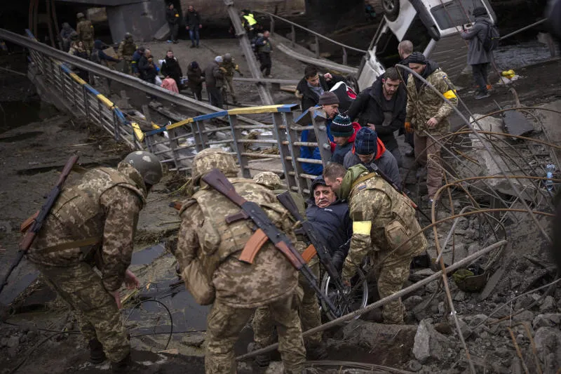 جنود أوكرانيون يساعدون مواطنين على عبور جسر فوق نهر إرفين قرب كييف دمره الروس في مارس الماضي (أ.ب)