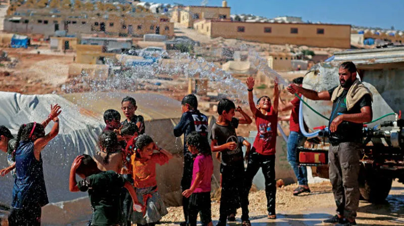 متطوعون في مخيم للنازحين بإدلب يرشون الأطفال بالمياه للتخفيف من أثر درجات الحرارة المرتفعة (أ.ف.ب)
