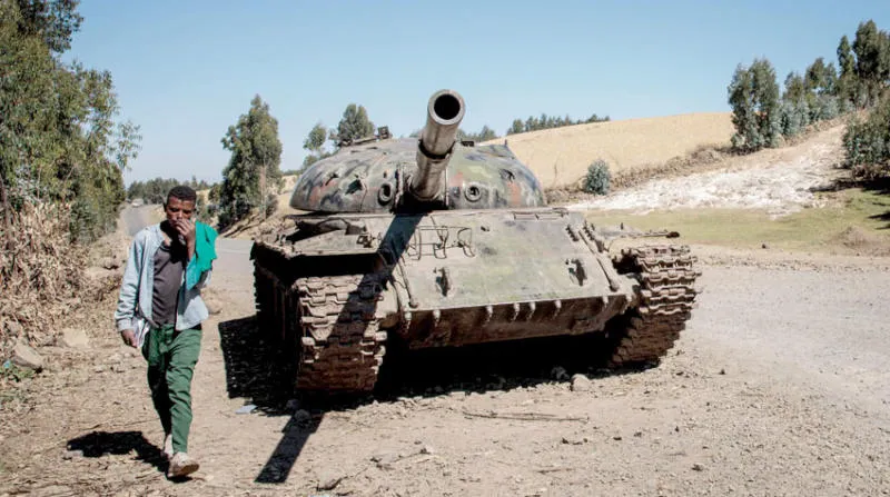 شاب إثيوبي يسير بجوار دبابة ضمن مواجهات بين الحكومة و«تيغراي» عام 2021 (أ.ف.ب)