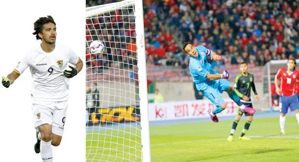 حارس تشيلي كلاوديو برافو يتابع الكرة في شباكه (أ.ب) - مارسيلو بعد اختتامه أهداف بوليفيا (إ.ب.أ)