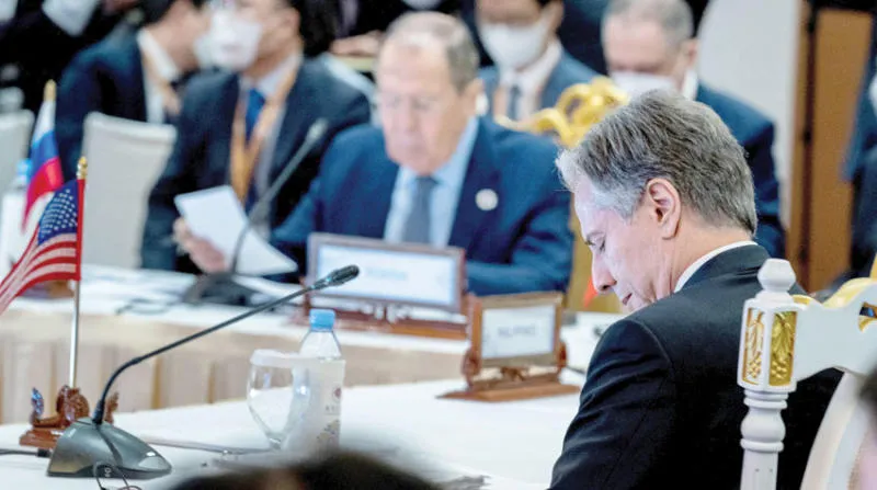 لافروف الممنوع من دخول الأراضي الأميركية بسبب العقوبات لن يتمكن من حضور اجتماعات الجمعية العمومية في نيويورك - وفي الصورة مع نظيره الأميركي بلينكن (يمين) خلال اجتماعات وزراء خارجية آسيان (رويترز)