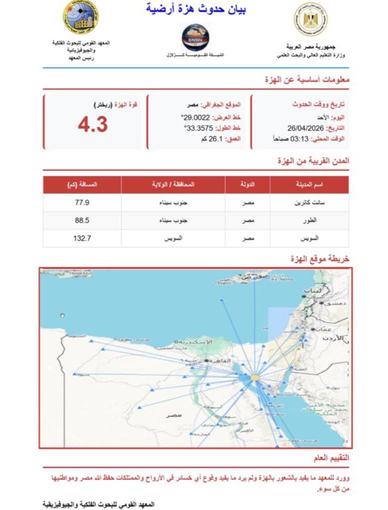 وأوضح «المعهد القومي للبحوث الفلكية والجيوفيزيقية في مصر»، في بيان، أن محطات الشبكة القومية لرصد الزلازل سجلت الهزة على بُعد 77.9 كلم من سانت كاترين، عند الساعة 3:13 صباحاً بالتوقيت المحلي، وعلى عمق 26.1 كلم ،من دون ورود بلاغات عن خسائر.