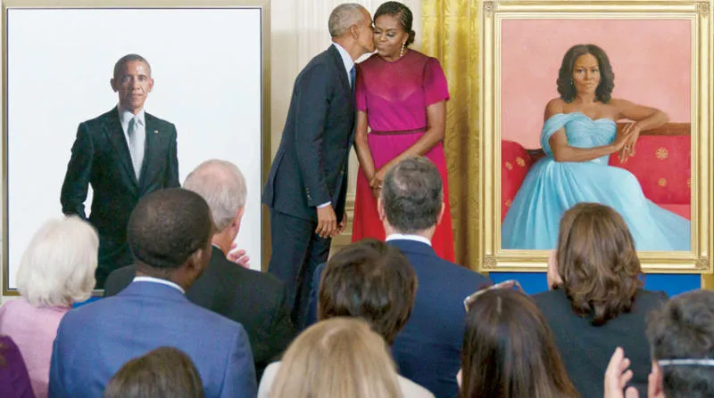 رفع باراك أوباما وزوجته ميشال الستارة في البيت الأبيض، الأربعاء، عن اللوحتين الرسميتين اللتين تمثلانهما، وكان الرئيس السابق مرحاً جداً فيما كانت الأميركية الأولى السابقة بالغة الجدية خلال إحياء تقليد المجاملة السياسية هذا الذي لم يشذّ عنه سوى دونالد ترمب.