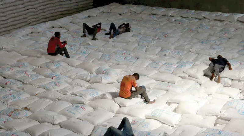 عمال يأخذون فترة راحة خلال تفريغ مساعدات غذائية مرسلة من أوكرانيا في مخزن لبرنامج الغذاء العالمي ببلدة أدما الإثيوبية يوم 8 سبتمبر الحالي (رويترز)