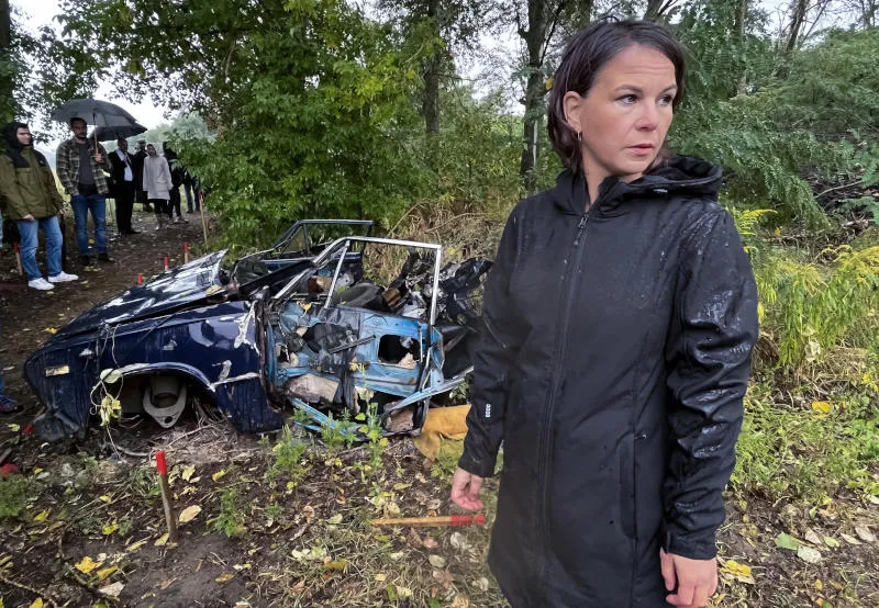 وزيرة الخارجية الألمانية أنالينا بيربوك قرب سيارة دمرها لغم روسي في منطقة قريبة من كييف (د.ب.أ)