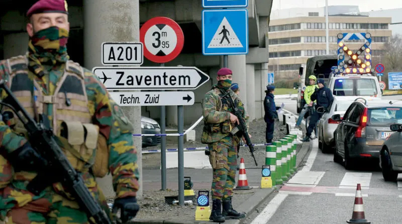 رجال أمن يحرسون مدخل مطار زافينتيم ببروكسل بعد الهجمات الإرهابية في مارس 2016 (أ.ف.ب)