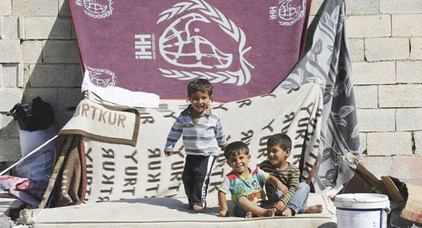 أطفال سوريون لاجؤن من بلدة تل أبيض الحدودية الشمالية يلعبون أمام خيمة في معسكر الإيواء على الجانب التركي من الحدود (رويترز)