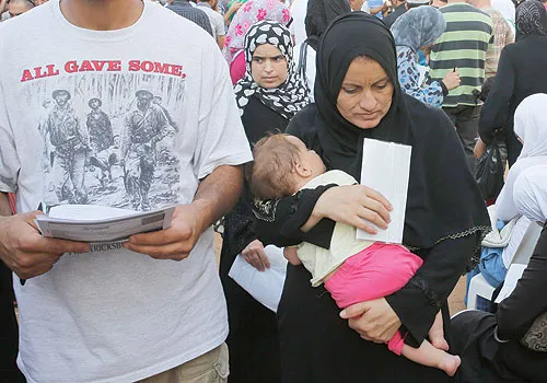 لاجئون سوريون يقومون بالتسجيل في المفوضية العليا للاجئين في بيروت أمس (رويترز)