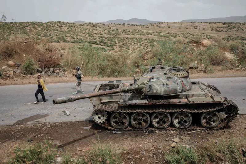 مزارعون يسيرون بجوار دبابة مُدمرة في منطقة تيغراي (أ.ف.ب)