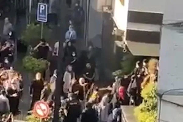 جانب من الاحتجاجات خارج المستشفى الذي توفيت فيه مهسا أميني (وسائل إعلام إيرانية)
