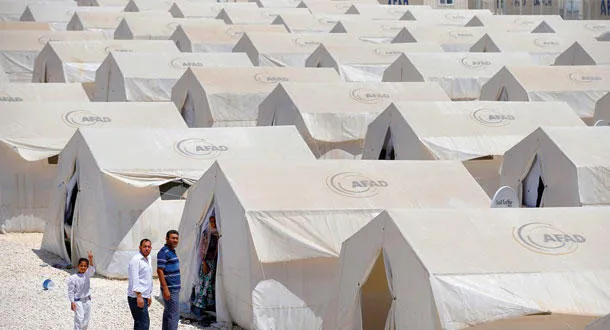 لاجئون سوريون يتمشون حول معسكر إيواء على الجانب التركي من الحدود السورية ـ التركية (أ.ب)
