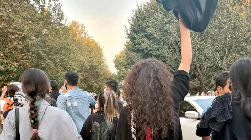 إيرانيات ينزعن الحجاب خلال احتجاجات بمحيط جامعة طهران أول من أمس (تويتر)