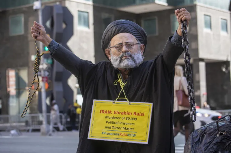 رجل متنكر بهيئة رئيسي يحتج على طريقته الخاصة ضد النظام الإيراني في نيويورك أمس (إ.ب.أ)