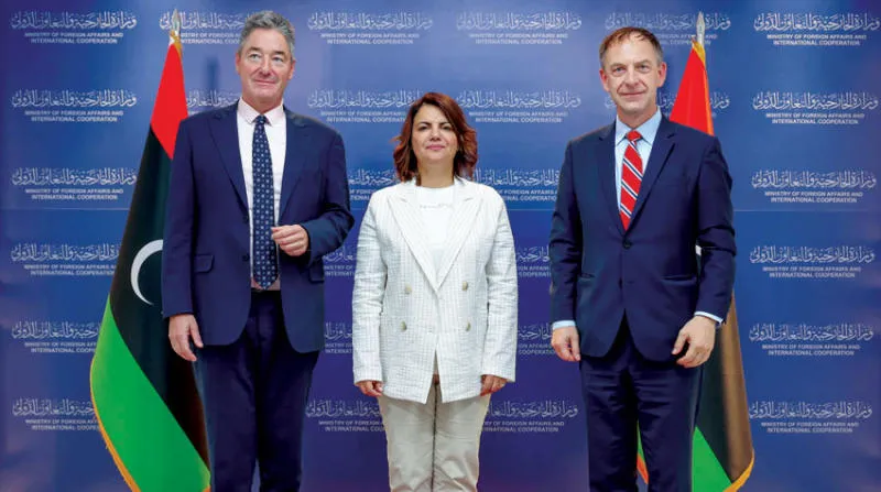 لقاء سابق لنجلاء المنقوش وزيرة الخارجية بحكومة «الوحدة» الليبية المؤقتة بالمبعوث الألماني إلى البلاد كريستيان باك «يمين» والسفير ميخائيل أونماخت (وزارة الخارجية الليبية)