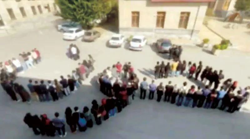 طلبة إيرانيون يقفون على شكل كلمة «خون» أي الدم في كلية الفنون بجامعة طهران أمس
