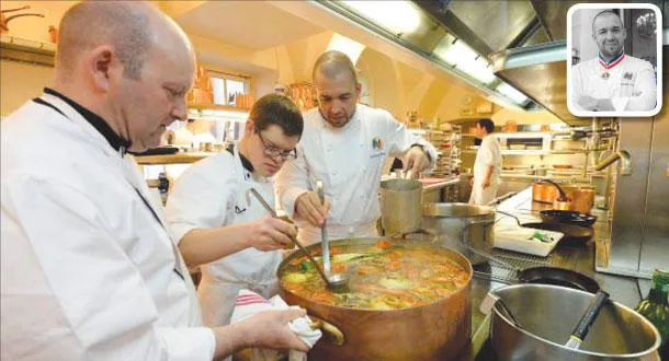 الشيف غوميز أثناء العمل في مطبخ القصر، وفي الإطار رئيس الطهاة في قصر الإليزيه غيوم غوميز
