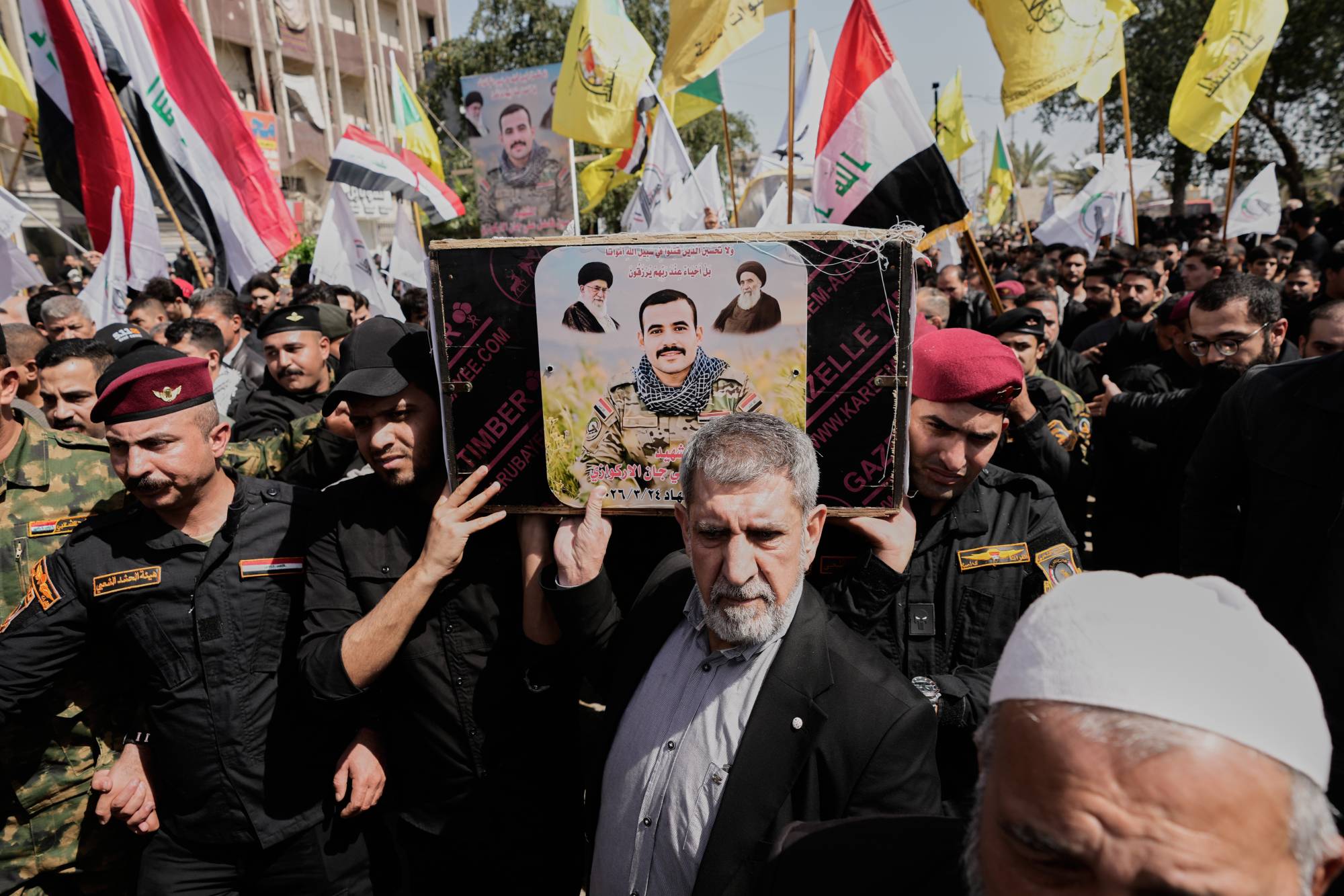 جانب من تشييع عنصر في «الحشد الشعبي العراقي» بمدينة الصدر في بغداد اليوم السبت بعد مقتله بغارة جوية في الأنبار يوم 24 مارس (أ.ب)