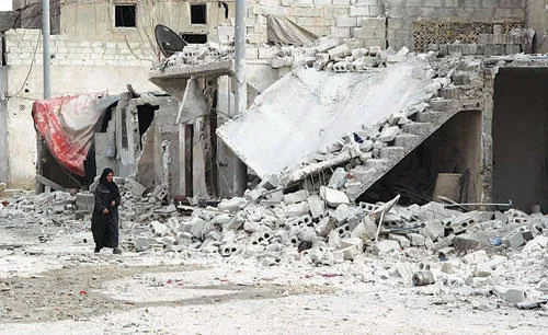 سورية تسير قرب الأنقاض في أحد شوارع مدينة حلب أمس (أ.ف.ب)