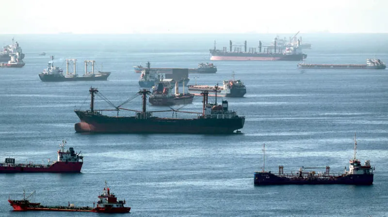 سفن شحن الحبوب الأوكرانية في مضيق البوسفور أمس تنتظر دورها لوصول المفتشين الدوليين (إ.ب.أ)