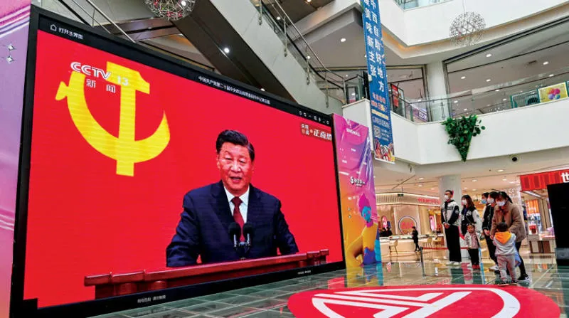 صينيون يتابعون تغطية تلفزيونية للرئيس شي خلال مؤتمر الحزب الشيوعي أول من أمس (أ.ف.ب)