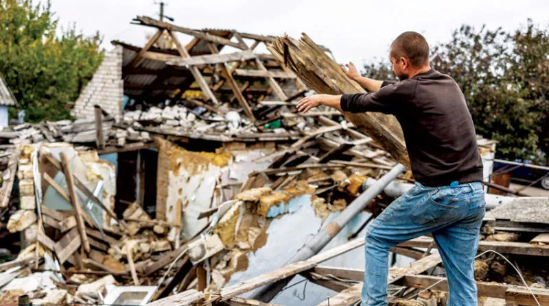 أوكراني يحاول ترميم منزله في قرية قرب خيرسون بعد أن استعادتها القوات الأوكرانية (إ.ب.أ)
