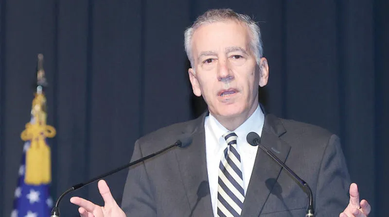 السفير الأميركي فيليب غولدبرغ يلقي كلمة في مؤتمر تحالف السلام الأميركي - الكوري في سيول أول من أمس (إ.ب.أ)