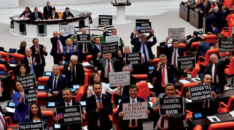 نواب من «حزب الشعب الجمهوري» يرفعون لافتات ضد مشروع القانون الخاص بالإعلام الإلكتروني الذي أقر أخيراً (رويترز)