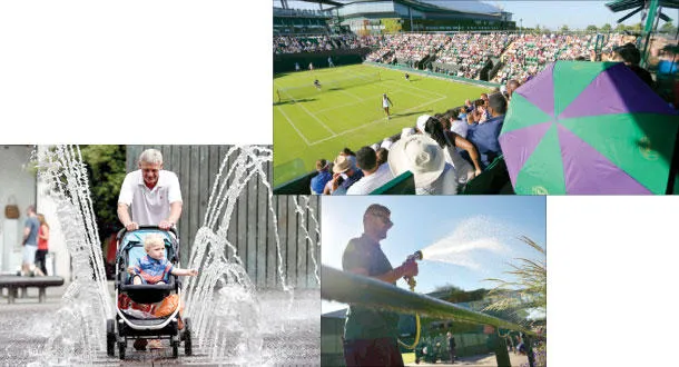 ويمبلدون يشهد معدلاً قياسيًا في ارتفاع درجات الحرارة (أ.ب)  -  عامل يرش العشب الأخضر في ملعب يمبلدون ضد الحرائق (إ.ب.أ)  -  موجة حر تضرب بريطانيا ومصدرها أفريقيا (أ.ف.ب)