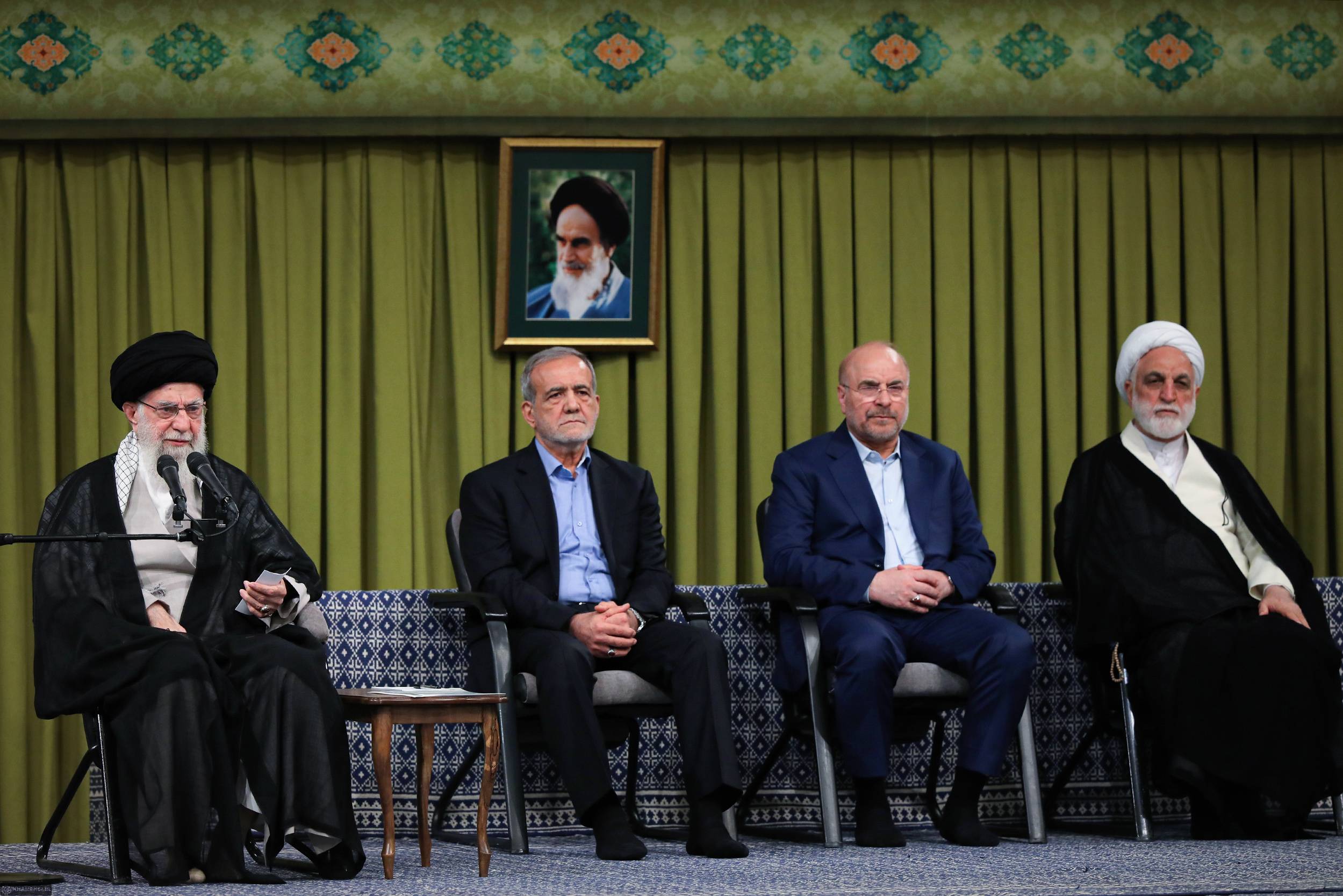 صورة نشرها موقع خامنئي وخلفه الرئيس مسعود بزشكيان ورئيس البرلمان محمد باقر قاليباف ورئيس القضاء غلام حسين محسني إجئي في طهران 21 سبتمبر 2024