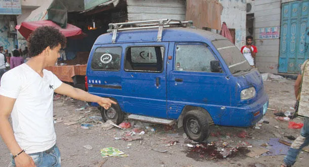 يمني يؤشر إلى المكان الذي سقط فيه أحد ضحايا المجزرة التي ارتكبتها الميليشيات الحوثية في عدن أمس (أ.ف.ب)