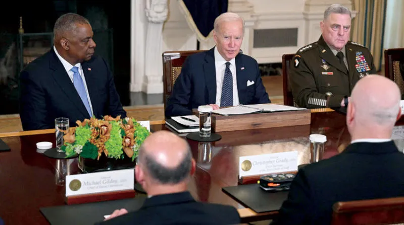 الرئيس بايدن يتوسط وزير الدفاع (يسار) والجنرال مارك ميلي رئيس هيئة الأركان المشتركة (أ.ف.ب)