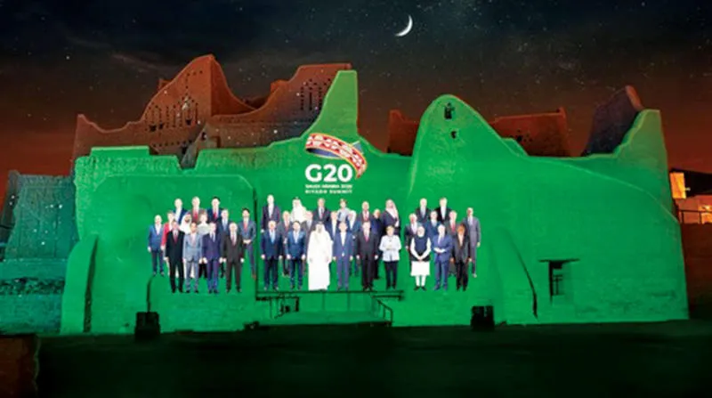 صورة تذكارية افتراضية لقادة «العشرين» على واجهة قصر سلوى بمحافظة الدرعية إبان استضافة السعودية لأعمال القمة في 20 نوفمبر 2020 (رويترز)