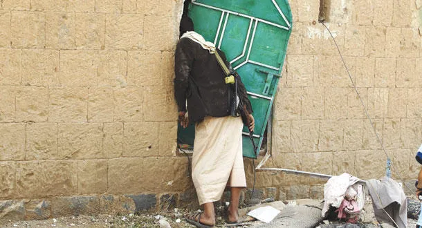 مسلح من المتمردين الحوثيين يتفقد منزلا بعد أن قصفته قوات التحالف أمس (إ.ب.أ)