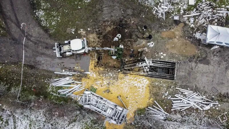 لقطة جوية تظهر موقع الضربة الصاروخية على بولندا بالقرب من الحدود مع أوكرانيا (أ.ف.ب)