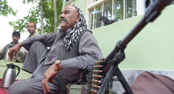 أحد زعماء الميليشيات الأفغانية الموالية للحكومة أمام مركز شرطة في قندز أمس (أ.ف.ب)