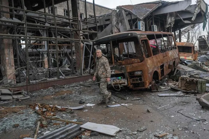 آثار المعارك في مباني مطار خيرسون الذي استولت عليه القوات الأؤكرانية أخيراً (أ.ف.ب)