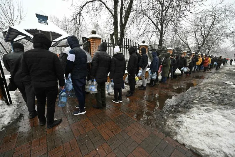 أشخاص ينتظرون للحصول على مياه شرب في كييف (أ.ف.ب)