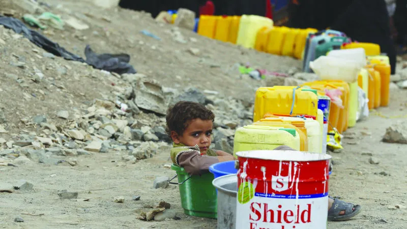 طفلة يمنية تجلس على «جركن» فارغ انتظارا لملئه بالماء وسط تعطل إمدادات المياه بالعاصمة اليمنية صنعاء (أ.ب)