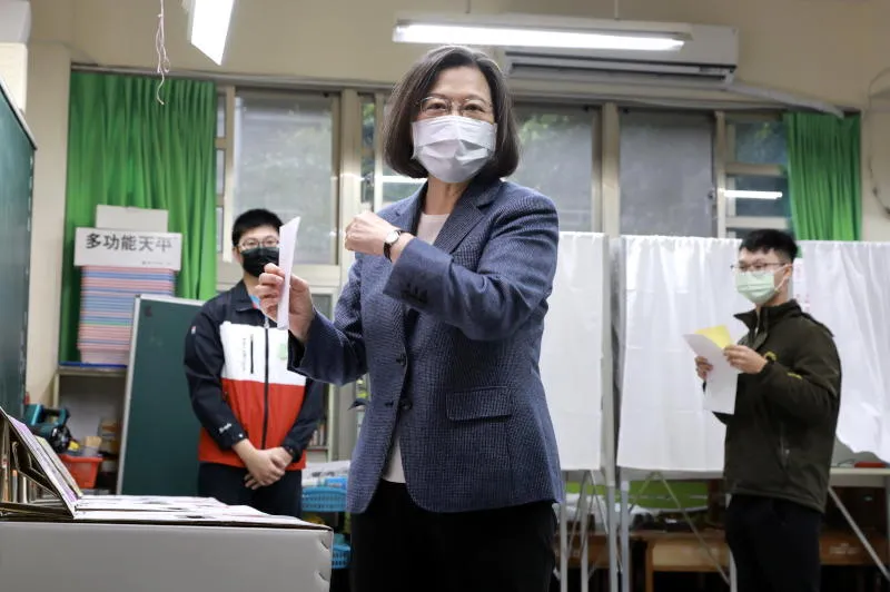 رئيسة تايوان تساي إينغ وين خلال الإدلاء بصوتها في الانتخابات المحلية (إ.ب.أ)