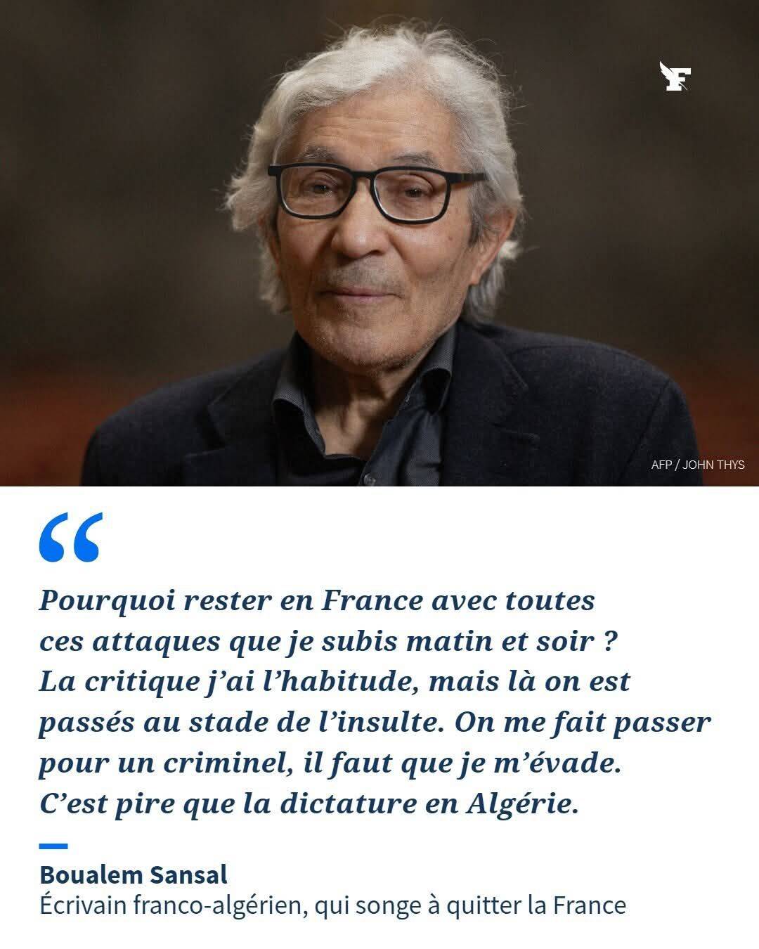 وفي تصريحات أخرى نقلتها وسائل إعلام فرنسية، قال صنصال: «لماذا أبقى في فرنسا مع كل هذه الهجمات التي أتعرَّض لها صباحاً ومساءً؟ أنا معتاد على النقد، لكننا هنا تجاوزنا مرحلة الإهانة. يتم تصويري مجرماً، يجب أن أهرب. هذا أسوأ من الديكتاتورية في الجزائر».