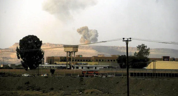 دخان يتصاعد من مخزن للسلاح في صنعاء بعد قصفه من قبل قوات التحالف بقيادة السعودية أمس (غيتي)