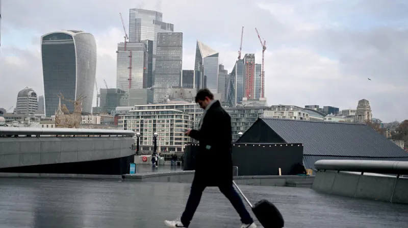 أحد المارة يعبر أمام الحي المالي وسط العاصمة البريطانية لندن (إ.ب.أ)