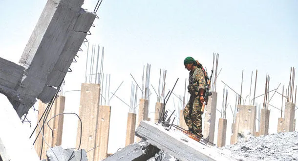 مقاتلة كردية ضمن وحدة الدفاع الشعبي تنظر إلى آثار الدمار في مدينة عين عيسي بالقرب من الرقة والتي خلفتها المواجهات بين الأكراد وداعش (أ.ف.ب)