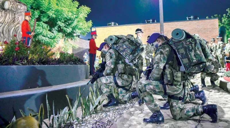 جنود كولومبيون يكرّمون ضحايا هجوم شنه متمردو «فارك» في كوكوتا يوم 9 ديسمبر الماضي (أ.ف.ب)