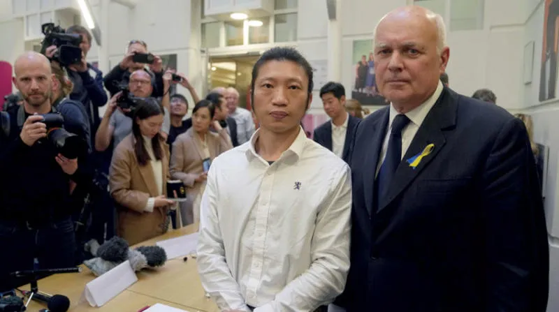 المتظاهر بوب تشان برفقة النائب المحافظ إيان دنكن سميث في لندن في 19 أكتوبر (أ.ب)