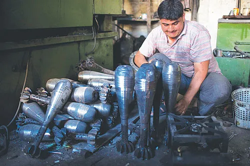 عامل سوري في ورشة بحلب يجهز قذائف «هاون» كي يستخدمها مقاتلو المعارضة (إ.ب.أ)