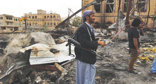 مسلحون يتفقدون الأضرار التي لحقت بالمباني الواقعة تحت سيطرة ميليشيات الحوثي وصالح في صنعاء جراء غارات جوية لقوات التحالف (أ.ب)